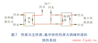 當今,多熱源熱泵技術日臻成熟,太陽能、風能、污水、土壤等眾多熱源均可作為低品質(zhì)熱源,通過熱泵轉換為高品質(zhì)熱源供熱。因此,在天津市能源集團“全市一網(wǎng)”戰(zhàn)略部署中,設置大型熱泵能源站,以熱泵為主熱源承擔廣大熱用戶的基本負荷,以集中供熱的熱水為調(diào)峰熱源,在尖峰時段加熱熱泵低溫熱水,充分利用熱泵能源的同時,也大大減小了集中供熱的一級管網(wǎng)流量,為實現(xiàn)集中供熱大規(guī)?;⒏嗟負屨脊崾袌龇蓊~起到了至關重要的作用。熱泵為主熱源、集中供熱熱源為調(diào)峰熱源的供熱系統(tǒng)見圖2。