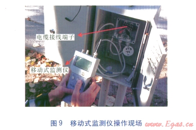 固定式監(jiān)測(cè)儀由220V電源供電,最大監(jiān)測(cè)管段長(zhǎng)度為5km,對(duì)于長(zhǎng)距離熱網(wǎng),應(yīng)根據(jù)監(jiān)測(cè)儀的最大監(jiān)測(cè)管段長(zhǎng)度,將熱網(wǎng)分為若干獨(dú)立的監(jiān)測(cè)回路。固定式監(jiān)測(cè)儀置于專門設(shè)備箱內(nèi),故障信號(hào)可上傳至監(jiān)測(cè)中心,實(shí)施遠(yuǎn)距離監(jiān)測(cè)系統(tǒng)集中管理。移動(dòng)式監(jiān)測(cè)儀能夠?qū)?span lang="EN-US">2~5km長(zhǎng)度范圍內(nèi)的管段進(jìn)行監(jiān)測(cè),可實(shí)現(xiàn)對(duì)附近沒有電源無法設(shè)置固定式監(jiān)測(cè)儀及某些分支管段的監(jiān)測(cè)。固定式監(jiān)測(cè)儀安裝現(xiàn)場(chǎng)、移動(dòng)式監(jiān)測(cè)儀操作現(xiàn)場(chǎng)分別見圖8、9。