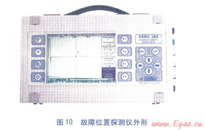 故障位置探測(cè)儀主要用于確定故障位置,一旦監(jiān)測(cè)中心接到報(bào)警信息,并確定報(bào)警固定式監(jiān)測(cè)儀具體位置,或由移動(dòng)式監(jiān)測(cè)儀監(jiān)測(cè)出故障管段。操作人員攜帶故障位置探測(cè)儀,對(duì)故障管段進(jìn)行故障點(diǎn)定位。故障位置探測(cè)儀的監(jiān)測(cè)管段長(zhǎng)度為2~10km,與電纜接線端子的接入方法與移動(dòng)式監(jiān)測(cè)儀相同,設(shè)備外形見圖10。
