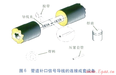管道補(bǔ)口信號(hào)導(dǎo)線的連接成套設(shè)備(見圖6)包括電纜夾、膠帶、壓緊套管、焊料、焊膏等,除可滿足管道補(bǔ)口信號(hào)導(dǎo)線的連接要求外,還可滿足其他位置信號(hào)導(dǎo)線的連接,以及信號(hào)導(dǎo)線與出線電纜的連接。