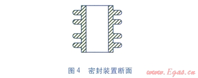 端部出線位置在保溫結(jié)束處,出線電纜采用三芯電纜接入保溫管,其中兩根導(dǎo)線分別連接兩根信號(hào)導(dǎo)線,第三根導(dǎo)線連接工作鋼管。端部出線方式分為兩種:第一種,通過安裝在保溫層堵板上的密封裝置引出,主要用于進(jìn)入建筑物內(nèi)部管道的信號(hào)電纜出線,見圖2。第二種,通過安裝在PE保護(hù)層上的密封裝置引出,主要用于建筑物外部管道的信號(hào)電纜出線,見圖3。密封裝置斷面見圖4。