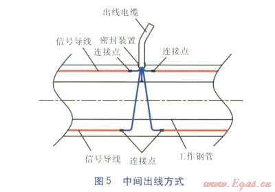 中間出線用于將整個(gè)管網(wǎng)分成若干一定長(zhǎng)度的管段,以滿足監(jiān)測(cè)儀最大監(jiān)測(cè)管段長(zhǎng)度的需要。出線電纜采用五芯導(dǎo)線,其中四根導(dǎo)線分別連接4根信號(hào)導(dǎo)線,第五根導(dǎo)線連接工作鋼管,出線電纜通過密封裝置引出,見圖5。
