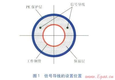 為了實(shí)現(xiàn)遠(yuǎn)距離監(jiān)測(cè)功能,在管子及管件的保溫層中內(nèi)置2根信號(hào)導(dǎo)線,截面積為1.5mm2。信號(hào)導(dǎo)線固定在PE保護(hù)層支撐塊上,并平行于工作鋼管[1],信號(hào)導(dǎo)線的設(shè)置位置見圖1。