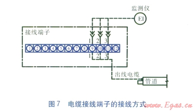 為了將監(jiān)測(cè)儀方便地接入監(jiān)測(cè)系統(tǒng),在監(jiān)測(cè)點(diǎn)附近沒置電纜接線端子。電纜接線端子可以方便接入監(jiān)測(cè)儀、接通或斷開出線電纜,接線方式見圖7。電纜接線端子置于專門設(shè)備箱內(nèi),根據(jù)熱網(wǎng)規(guī)模和走向需要布置若干個(gè)設(shè)備箱,并安裝在干燥及通風(fēng)良好的環(huán)境中。對(duì)于相對(duì)濕度較高的場(chǎng)所,應(yīng)采用密封設(shè)備箱。