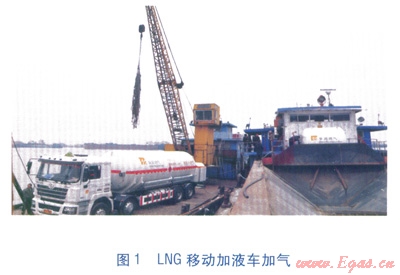 對于采用瓶組式LNG儲氣系統(tǒng)的改裝船,可以將提前充裝好的備用瓶組運至碼頭,每只容積500L的鋼瓶充液后質(zhì)量約700kg,加氣時改裝船??吭诖a頭,用簡易吊裝設(shè)備即能吊換LNG瓶組。如遇枯水期船舶無法靠岸,也可用小船運輸LNG瓶組至改裝船進行吊換。應急加氣方式經(jīng)濟實用,對碼頭的要求低,適用于船舶油改氣項目初期試點階段。