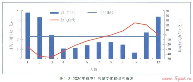 2020年有電廠、2020年無(wú)電廠兩種情況供氣曲線、用氣曲線、儲(chǔ)氣設(shè)施工作曲線合成圖分別如圖1-3、1-4所示,圖中供應(yīng)曲線、用氣曲線對(duì)應(yīng)左側(cè)縱坐標(biāo),儲(chǔ)氣曲線對(duì)應(yīng)右側(cè)縱坐標(biāo)。用氣曲線代表負(fù)荷的逐月變化情況,供氣曲線代表氣源在一年內(nèi)連續(xù)均勻供氣,儲(chǔ)氣曲線代表自計(jì)算開始時(shí)算起天然氣供應(yīng)量累計(jì)值與用氣量累計(jì)值之差。