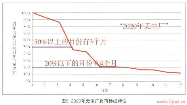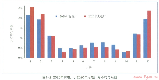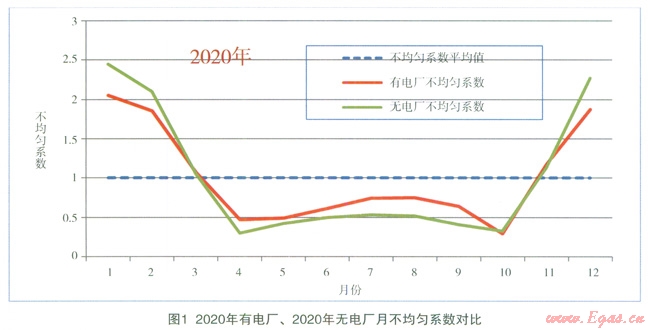 計(jì)算表明:預(yù)計(jì)到2020年,“有電廠”的最大月不均勻系數(shù)為2.05,“無(wú)電廠”為2.45,“有電廠”的最大月不均勻系數(shù)最小,“峰值”與“均值”的偏離程度最小,如圖1所示。