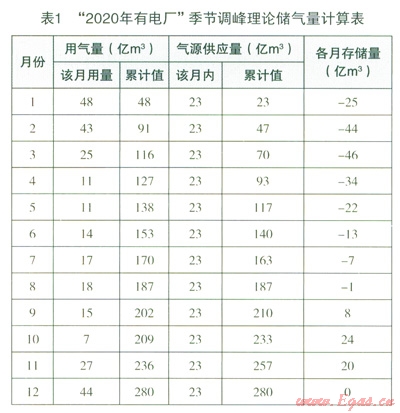 據(jù)圖1-3可以看“2020年有電廠”的情況,4月至10月份供氣量大于月平均氣量,假設(shè)按月平均氣量均勻供氣(供氣曲線),供氣量大于用氣量,由儲(chǔ)氣設(shè)施存儲(chǔ)多余供應(yīng)的部分;其它月份供氣量小于用氣量,由儲(chǔ)氣設(shè)施供氣以補(bǔ)充氣源不足的部分。以“2020年有電廠”為例,所需理論儲(chǔ)氣量的計(jì)算辦法如下,每月用氣量如表l第二列所示,第三列為計(jì)算開始時(shí)算起的天然氣廂氣量累計(jì)值,第四列所示為每月平均供氣量,第五列與第三列之差即為月末天然氣的存儲(chǔ)量(天然氣供應(yīng)量累計(jì)值與用氣量累計(jì)值之差)。第六列中找出最大值和最小值,兩個(gè)數(shù)的絕對(duì)值之和即為所需要的儲(chǔ)氣量。