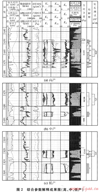 由交會圖和高、中、低產(chǎn)綜合參數(shù)的統(tǒng)計分析,可以得出高、中、低產(chǎn)產(chǎn)能劃分標準(表2)。圖2為高、中、低產(chǎn)層的綜合特征解釋成果圖。