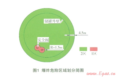 儲罐所處爆炸危險環(huán)境的危險介質(zhì)是甲烷、其分級分組為Ⅱ AT1。危險介質(zhì)及其分級分組與GB50058—92《爆炸和火災(zāi)危險環(huán)境電力裝置設(shè)計規(guī)范》附錄三氣體或蒸氣爆炸性混合物分級分組舉例完全一致。