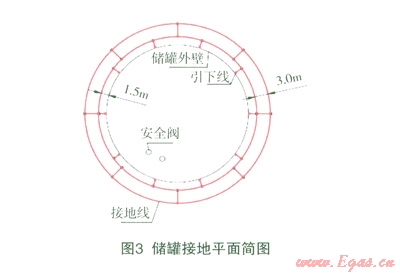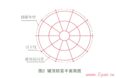 外方設(shè)計圖紙中沒有明確全容罐屬于幾類防雷建筑物,但從具體做法上判斷全容罐被劃為第二類防雷建筑物。其中防直擊雷的措施是在全容罐罐頂及罐壁安裝接閃帶,接閃帶采用截面為70mm:鍍錫裸銅絞線組成不大于10m×10m網(wǎng)格,引下線亦為截面為70mm:鍍錫裸銅絞線,間隔不大于10m。接閃帶之間采用壓接方式連接,用膨脹螺栓固定,固定點間距0.9m。對比國內(nèi)GB50057—2010《建筑物防雷設(shè)計規(guī)范》第4.3.1款規(guī)定,其防直擊雷設(shè)計更趨嚴格,并且在材料選擇上與發(fā)達國家一致。