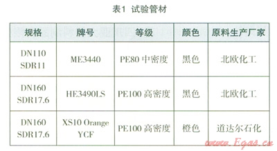 為了驗證不同等級及有無炭黑聚乙烯燃氣管材的吸水程度、對接焊麻點出現(xiàn)程度及其影響大小,該試驗分別選取了中密度聚乙烯原材料ME3440(含炭黑)、高密度聚乙烯原材料HE3490LS(含炭黑)及橙色高密度聚乙烯原材料XSl0 Orange YCF(不含炭黑)生產(chǎn)出的管材(詳見表1);為保證水份充分滲透,將管材浸泡在常溫水中,浸泡時間為2年。
