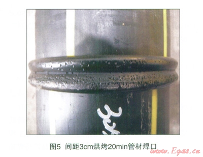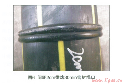 烘烤溫度要求能烘出管材端面所含水分但不能過高導致管材端面熔融無法焊接。水的沸騰汽化溫度是100%,聚乙烯管材的熔融溫度是190℃,ME3440,PE80,中密度聚乙烯管材的焊接溫度(加熱板的溫度)為200%~220%,管材斷面到熱板吸熱面對距離為2cm~3cm的烘烤溫度適宜。烘烤時間不能超過聚乙烯管材的氧化時間,ME3440,PE80,巾密度聚乙烯燃氣管材的210℃氧化誘導時間為40min左右,取烘烤時間為20min、30min來進行試驗驗證,焊接中加熱板溫度為最低焊接溫度210℃,焊接效果見圖4、圖5。
