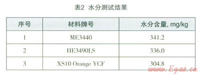 測試結(jié)果表明:3種材料聚乙烯燃氣管材均具有吸水性,并且水分含量相差不大,均大于300mg/kg。