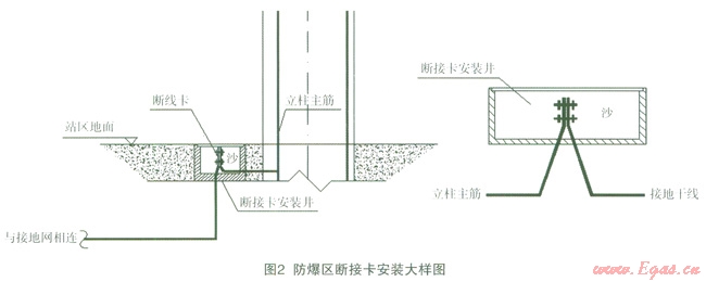 屋面避雷帶及接閃短桿均與建筑物鋼筋混凝土立柱內(nèi)主筋相焊接,鋼筋混凝土立柱內(nèi)(兩根不少于Æ16)主鋼筋做引下線(引下線采用綁扎連接),與接地網(wǎng)作可靠電氣連接。作引下線的立柱應(yīng)沿建筑物四周均勻布置,間距不得大于18m。很多設(shè)計員存距地面0.3m~0.5m的立柱上設(shè)斷接卡與站內(nèi)的人工接地網(wǎng)相連接,但壓縮機(jī)間、工藝罩棚立柱周圍都處于防爆區(qū),在防爆區(qū)內(nèi)直接設(shè)置斷接卡存在很大的安全隱患,所以防爆區(qū)內(nèi)引下線斷接卡應(yīng)采用防爆接線盒安裝,并用防爆膠泥密封,或者是設(shè)置在地面上,用干沙填實。尤其是LNG場站更需注意,因為LNG泄漏后迅速氣化而形成的低溫氣體比重較大,會聚集在地面附近,遇到斷接卡放電時極易發(fā)生爆炸。