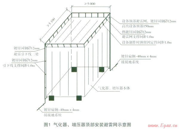 LNG場站中LNG儲罐的壁厚大于10mm,即使遭受雷擊也不會被擊穿,一般將LNG儲罐本體直接作為接閃器。氣化器和增壓器管道壁厚不大于4.0mm,有可能被閃電擊穿而發(fā)生爆炸事故,所以必須對場站內(nèi)的氣化器和增壓器做好防雷措施。氣化器和增壓器的防雷有兩種方法,一種是采用避雷塔對站區(qū)內(nèi)的所有工藝裝置進(jìn)行整體的防護(hù),另外一種是在氣化器和增壓器上單獨設(shè)置小型避雷針或避雷帶。因為LNG場站一般比較大,所以若采用避雷塔,則避雷塔的高度必須非常高,基礎(chǔ)也非常大,在進(jìn)行總平面圖設(shè)計時必須考慮避雷塔的影響。避雷塔在竣工驗收及以后的運行過程中均需要當(dāng)?shù)氐臍庀蠓览撞块T進(jìn)行專門檢測,而且避雷塔的造價及運行維護(hù)成本均非常高,所以采用避雷塔會給設(shè)計、施工、運行維護(hù)都帶來許多的不便,不推薦采用。當(dāng)在氣化器及增壓器上設(shè)置小型的避雷針或避雷帶時需要特別注意,因為氣化器和增壓器都屬于內(nèi)含危險物質(zhì)的特種設(shè)備,為避免現(xiàn)場施工對沒備造成損壞,也便于發(fā)生事故后的責(zé)任劃分,一般要求氣化器和增壓器廠家在工廠內(nèi)將小型避雷針或避雷帶及其引下線安裝完成,現(xiàn)場施工只負(fù)責(zé)接地,所以電氣設(shè)計人員在甲方進(jìn)行設(shè)備采購階段時就應(yīng)該與甲方進(jìn)行詳細(xì)的溝通說明。