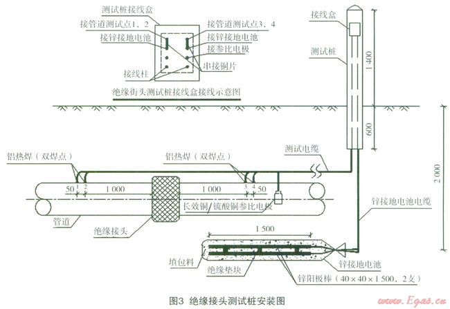 工藝專業(yè)一般都在加氣站、門站、調(diào)壓站等場站的進(jìn)出站管道上設(shè)有絕緣接頭。絕緣接頭的功能主要有兩個,一是將陰極保護(hù)電流限制在站外管道上,防止陰極保護(hù)電流通過站內(nèi)工藝裝置的接地系統(tǒng)流失,二是將站內(nèi)設(shè)備的雜散電流隔絕在站內(nèi),防止雜散電流流到站外長輸管道或者城市管網(wǎng)上造成雜散電流干擾腐蝕。但絕緣接頭只能作為隔絕管道陰極保護(hù)電流及站內(nèi)雜散電流用,而不能作為過電壓的安全防護(hù)措施用,站內(nèi)及管道上因雷擊產(chǎn)生的高電壓、站內(nèi)設(shè)備故障產(chǎn)生的高電壓、管道上因氣流摩擦而產(chǎn)生的靜電、長輸管道的感應(yīng)過電壓等都會將絕緣接頭損壞。絕緣接頭一旦損壞就會對長輸管道或者城市管網(wǎng)的陰極保護(hù)系統(tǒng)造成嚴(yán)重影響,甚至使陰極保護(hù)系統(tǒng)失效,所以必須為絕緣接頭添加防護(hù)措施。絕緣接頭的防護(hù)裝置主要有避雷器、電解接地電池、極化電池及二極管保護(hù)器,目前應(yīng)用最廣泛的是接地電池。接地電池是用來提供一個低電阻通道,排放強電電涌但不泄漏陰極保護(hù)直流電流的一種裝置,通常采用鋅材料制作[1]。