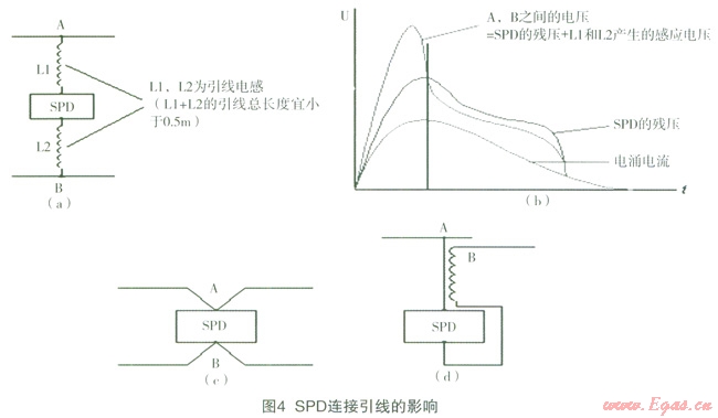 在各級配電柜/箱及信息系統(tǒng)線路上安裝相應(yīng)級別的電涌保護(hù)器(SPD),以把雷電流及電氣系統(tǒng)故障電流盡可能地泄入大地,保護(hù)用電設(shè)備的安全。為使SPD安裝處呈現(xiàn)的最大電涌電壓足夠低,SPD兩端的引線應(yīng)做到最短(兩端引線總長度不宜大于0.5m),并且要避免形成過大環(huán)路,以獲得最佳保護(hù)效果。當(dāng)引線較長而產(chǎn)生的引線寄生感應(yīng)電壓較大時,可采用圖4中(c)、(d)的接線,以轉(zhuǎn)移和補償引線的寄生電感,從而改善保護(hù)電路的性能[2]。