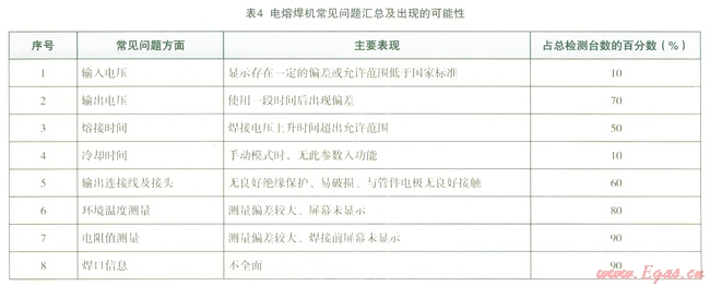 表4匯總了檢測(cè)過(guò)程中發(fā)現(xiàn)的常見(jiàn)問(wèn)題以及占總檢測(cè)臺(tái)數(shù)的百分?jǐn)?shù)。其中常見(jiàn)的直接影響焊接質(zhì)量的問(wèn)題主要是輸出電壓和環(huán)境溫度測(cè)量,而電阻值測(cè)量與焊口信息兩方面是電熔焊機(jī)普遍存在的問(wèn)題。這應(yīng)引起焊機(jī)廠家與焊接質(zhì)量管理部門的重視。