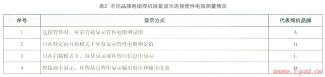其二,各品牌焊機(jī)對(duì)連接管件電阻測(cè)量功能存在明顯的差異。一方面,表2匯總了常見(jiàn)品牌焊機(jī)焊接前屏幕顯示連接管件電阻測(cè)量值的情況??梢钥闯?,有砦品牌焊機(jī)在焊接前不顯示或不直接顯示,這是不滿足國(guó)家標(biāo)準(zhǔn)的要求。另一方面,當(dāng)電熔管件電阻值較小時(shí),大部分電熔焊機(jī)的電阻測(cè)量偏差超出標(biāo)準(zhǔn)規(guī)定的測(cè)量偏差允許范同。檢測(cè)中發(fā)現(xiàn),某個(gè)焊機(jī)在連接2W管件時(shí),焊接前屏幕顯示測(cè)量電阻值為60W。這既與焊機(jī)的電阻測(cè)量精度有關(guān),又與連接接頭的接觸電阻有關(guān)。