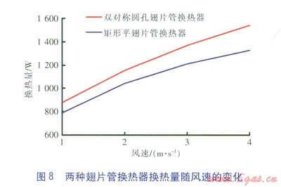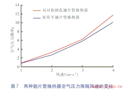 對(duì)稱圓孔翅片管具有優(yōu)越的強(qiáng)化傳熱效果。風(fēng)速范圍為l~4m/s時(shí),與矩形平翅片管換熱器相比,對(duì)稱圓孔翅片管換熱器的換熱量平均提高了12.8%,空氣壓力降提高并不明顯。