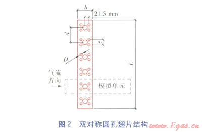 研究對(duì)象選取單排換熱管的矩形平翅片管換熱器、雙對(duì)稱圓孔翅片管換熱器,幾何尺寸按照文獻(xiàn)[7]中實(shí)驗(yàn)樣件的尺寸確定,基本尺寸:換熱管外徑Do為25mm,翅片厚度d為0.5mm,換熱管間距d為76mm,翅片間距s為10mm,翅片寬度b為6lmm,翅片長(zhǎng)度L為296mm,圓孔間距e為26mm,圓孔直徑D為14mm。兩種翅片管換熱器的翅片數(shù)均為28片,矩形平翅片管換熱器總換熱面積為1.1139m2,雙對(duì)稱圓孔翅片管換熱器總換熱面積為1.1089m2。由于翅片管換熱器所有翅片幾何結(jié)構(gòu)相同,為了簡(jiǎn)化研究,取單個(gè)翅片作為研究對(duì)象,根據(jù)對(duì)稱特性,取其中的一個(gè)區(qū)域作為模擬單元進(jìn)行研究。矩形平翅片、雙對(duì)稱圓孔翅片結(jié)構(gòu)分別見(jiàn)圖1、2。