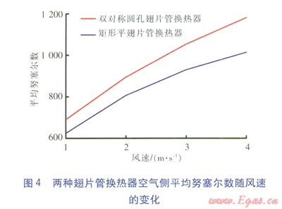 兩種翅片管換熱器空氣側(cè)平均努塞爾數(shù)隨風(fēng)速的變化見(jiàn)圖4。由圖4可知,隨著風(fēng)速的增大,兩種翅片管換熱器空氣側(cè)平均努塞爾數(shù)均明顯增大,且相同風(fēng)速下雙對(duì)稱圓孔翅片管換熱器空氣側(cè)平均努塞爾數(shù)明顯高于矩形平翅片管換熱器。