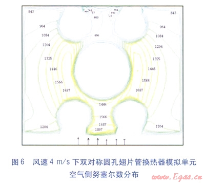 風(fēng)速4m/s下兩種模擬單元空氣側(cè)努塞爾數(shù)分布見(jiàn)圖5、6。由圖5、6可知,矩形平翅片管換熱器模擬單元空氣側(cè)努塞爾數(shù)的最大值出現(xiàn)在換熱管的兩側(cè),雙對(duì)稱圓孔翅片管換熱器模擬單元的最大值出現(xiàn)在流動(dòng)的起始位置;最小值均出現(xiàn)在換熱管后尾流區(qū)。在相近位置上,雙對(duì)稱圓孔翅片管換熱器模擬單元空氣側(cè)努塞爾數(shù)明顯高于矩形平翅片管換熱器模擬單元,這說(shuō)明前者的傳熱性能優(yōu)于后者。