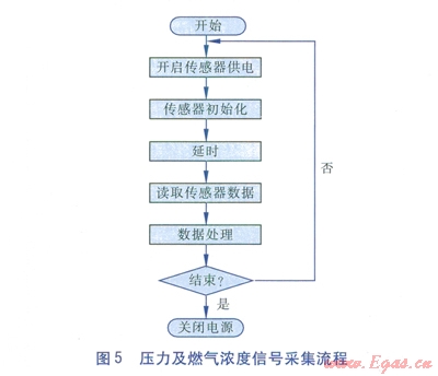 系統(tǒng)按照設(shè)定頻率,定時(shí)啟動(dòng)數(shù)據(jù)采集,采集過程嚴(yán)格控制傳感器供電時(shí)間,既充分考慮了低功耗需求,又可以避免供電時(shí)間太短造成傳感器數(shù)據(jù)未達(dá)到穩(wěn)定水平。壓力及燃?xì)鉂舛刃盘?hào)采集流程見圖5。