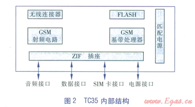 在野外閥門井監(jiān)測(cè)點(diǎn)和調(diào)度中心,數(shù)據(jù)的接收和發(fā)送采用GSM模塊TC35,它具有語音呼叫、數(shù)據(jù)呼叫、短消息等多種功能,本系統(tǒng)主要采用GSM模塊TC35的短消息接收和發(fā)送功能,模塊內(nèi)部結(jié)構(gòu)見圖2。
