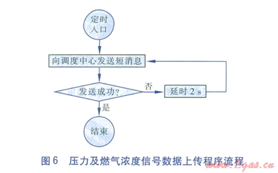 系統(tǒng)會(huì)將定時(shí)采集到的壓力及燃?xì)鉂舛刃盘?hào)數(shù)據(jù),以短信形式定時(shí)向調(diào)度中心接收端GSM模塊發(fā)送,詳見圖6。