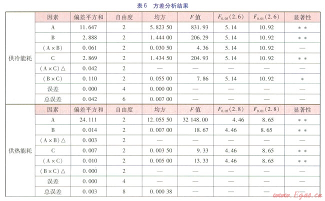 A×C交互作用的偏差平方和最小,作為誤差處理。FA、FB、FC(即A、B、C的F值,其他類似表示意義與此相同)均大于F0.01(2.6),即A、B、C三個(gè)因素對供冷能耗的影響為高度顯著。F0.05(2.6)<FB×C<F0.01(2.6),即B×C交互作用顯著;FA×C<F0.05(2.6),即A×C交互作用不顯著。