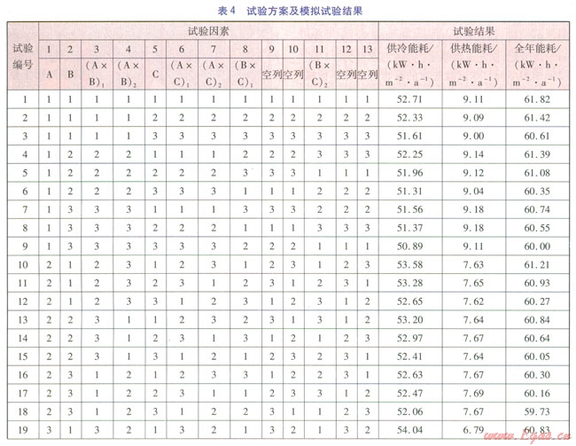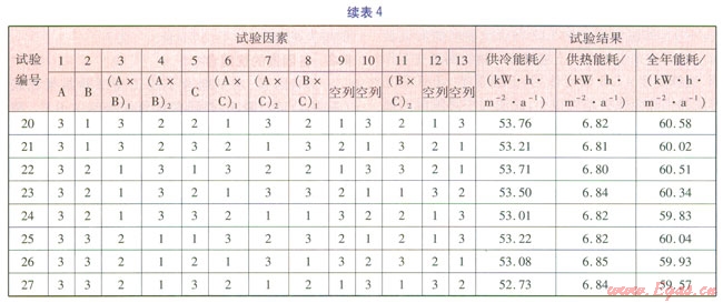 正交試驗(yàn)的指標(biāo)有供冷能耗、供熱能耗和全年能耗,其中全年能耗為供冷能耗和供熱能耗之和。正交試驗(yàn)?zāi)M結(jié)果見表4。