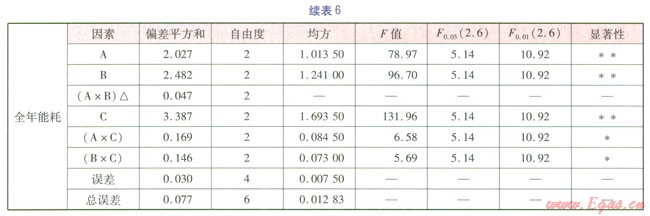 A×B交互作用的偏差平方和小于誤差偏差平方和的2倍,把A×B作為誤差處理。FA、FB、FC均大于F0.01(2.6),即A、B、C三個(gè)因素對全年能耗的影響為高度顯著。F0.05(2.6)<FB×C<F0.01(2.6),F0.05(2.6)<FB×C<F0.01(2.6),即A×C、B×C交互作用對全年能耗的影響顯著。