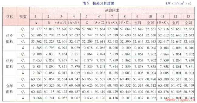 極差法可以簡單、快捷地確定各因素對指標(biāo)影響的主次順序,方差分析法利用F檢驗(yàn)可以考察正交試驗(yàn)因素對指標(biāo)的影響是否顯著。因此,本文結(jié)合極差法和方差分析法對試驗(yàn)結(jié)果進(jìn)行分析,得到種植屋面能耗影響因素的主次順序,并差別各個(gè)因素的顯著性,通過直觀分析綜合比較,確定最優(yōu)試驗(yàn)方案。