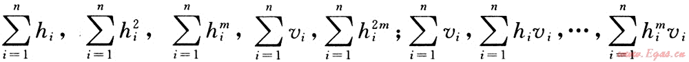 對m+1個(gè)未知數(shù)ni(i=0,1,2,…,m)的線性方程組,可以證明它的系數(shù)行列式不等于零,進(jìn)而可以唯一確定并解得以上各式中所需的系數(shù)ai。在進(jìn)行計(jì)算時(shí),只要算出以下各數(shù)量就可以得出正規(guī)方程組。這些數(shù)量分別為: