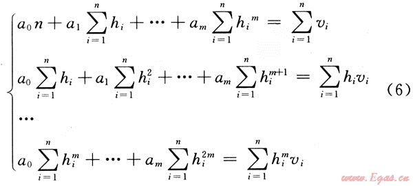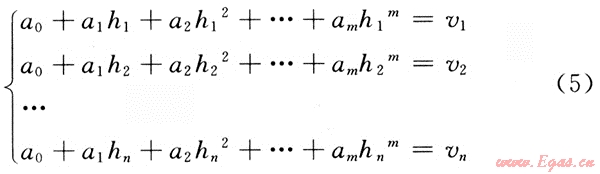 必須做的是要確定其中的系數(shù)a0,a1,…,am。將n對數(shù)據(jù)(vi,hi)代入式(4),就得到一個(gè)具有m+1個(gè)未知數(shù)ai的n個(gè)方程的矛盾方程組: