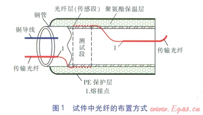 試件為一段長度為200mm的鋼管(材質為Q235),對銹蝕測試段外壁進行拋光處理,拋光后測試段外直徑為73.8mm,壁厚為3.5m。試件中光纖的布置方式見圖l。在距鋼管端面50mm處纏繞光纖層(傳感段),纏繞時使光纖帶有一定的預應力,保證光纖與鋼管表面緊密接觸,纏繞的光纖總長度在4m左右。將光纖用環(huán)氧樹脂膠固定在鋼管上,傳感段的引出端與帶保護套的傳輸光纜熔接,將熔接處進行保護處理,并在鋼管兩端的引出位置用環(huán)氧樹脂膠進行固定。光纖設置完畢后,在鋼管與PE保護管間進行發(fā)泡處理。