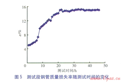 由測試結果可知,發(fā)生銹蝕前測試段外直徑D1為73.8mm,電化學加速銹蝕結束后測試段鋼管不包含銹蝕層的外直徑D1為72.8mm,代入式(2)可計算得到電化學加速銹蝕結束后測試段鋼管質量損失率e為0.149,此時傳感段光纖的應變?yōu)?span lang="EN-US">2161.0×10-6。由式(7)可計算得到,由銹蝕導致的測試段體積膨脹率h為l.16。設定在鋼管發(fā)生銹蝕后h保持不變,則可由布里淵分析儀讀取的傳感段光纖應變及式(7)計算得到各時刻測試段鋼管質量損失率。測試段鋼管質量損失率隨測試時間的變化見圖5。