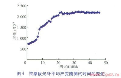 將5個連續(xù)有效測點的光纖平均應變作為傳感段光纖平均應變,傳感段光纖平均應變隨測試時間的變化見圖4。