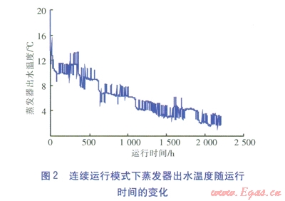 連續(xù)運(yùn)行模式下蒸發(fā)器出水溫度隨運(yùn)行時間的變化見圖2。由圖2可知,在整個供暖期內(nèi),蒸發(fā)器出水溫度持續(xù)下降。熱泵機(jī)組的制熱量根據(jù)末端負(fù)荷動態(tài)調(diào)節(jié),蒸發(fā)器出水溫度相應(yīng)出現(xiàn)波動。連續(xù)運(yùn)行模式下,蒸發(fā)器出水溫度低于5℃的時間約720h,約占整個供暖期的32.6%,最低為1.54℃。因此,當(dāng)采用連續(xù)運(yùn)行模式時,易觸發(fā)熱泵機(jī)組的保護(hù)性停機(jī),導(dǎo)致熱泵空調(diào)系統(tǒng)無法運(yùn)行。