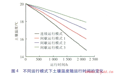不同運(yùn)行模式下土壤溫度隨運(yùn)行時間的變化見圖4。由圖4可知,熱泵機(jī)組運(yùn)行時土壤溫度逐漸下降,下降幅度與地埋管換熱器的運(yùn)行模式有關(guān)。連續(xù)運(yùn)行模式下,到供暖末期,土壤溫度由初期的20℃降為14.72℃,降幅達(dá)5.28℃。間歇運(yùn)行模式1下,到供暖末期,土壤溫度為16.01℃,降幅為3.99℃。間歇運(yùn)行模式2下,到供暖末期,土壤溫度為l7.08℃,降幅為2.92℃。間歇運(yùn)行模式3下,到供暖末期,土壤溫度為17.91℃,降幅為2.09℃。由以上分析可知,當(dāng)日開停比減小時,地埋管換熱器運(yùn)行時間減少,從土壤提取的熱量減少,土壤溫度下降幅度減小。但由于每天的恢復(fù)時間較短,不足以使土壤溫度有明顯的改變。