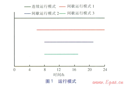 對于地埋管換熱器間歇運(yùn)行模式,將每日的運(yùn)行時間與非運(yùn)行時間之比定義為日開停比。為了比較連續(xù)運(yùn)行與間歇運(yùn)行模式以及不同日開停比的間歇運(yùn)行模式下熱泵機(jī)組的性能,選取連續(xù)運(yùn)行模式和3種間歇運(yùn)行模式進(jìn)行對比分析,各運(yùn)行模式見圖1。間歇運(yùn)行模式1的日開停比為l8:6,間歇運(yùn)行模式2為13:11,間歇運(yùn)行模式3為9-15。模型不考慮地埋管換熱器間歇運(yùn)行對空調(diào)房間供暖的影響,認(rèn)為地埋管換熱器停用時段由太陽能熱水系統(tǒng)或其他低溫?zé)嵩刺娲寥涝础?span lang="EN-US">