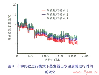 3種間歇運(yùn)行模式下蒸發(fā)器出水溫度隨運(yùn)行時間的變化見圖3。由圖3可知,3種間歇運(yùn)行模式下蒸發(fā)器出水溫度的下降幅度均小于連續(xù)運(yùn)行模式。對于間歇運(yùn)行模式l,蒸發(fā)器最低出水溫度為3.49℃,高于連續(xù)運(yùn)行模式,但仍然低于蒸發(fā)器出口溫度推薦范圍的下限,整個供暖期蒸發(fā)器出水溫度低于5℃的時間約260h。對于間歇運(yùn)行模式2,蒸發(fā)器最低出水溫度為4.95℃,高于間歇運(yùn)行模式l,而間歇運(yùn)行模式3的蒸發(fā)器最低出水溫度為5.86℃。因此,日開停比越小,熱泵機(jī)組的運(yùn)行工況越好。