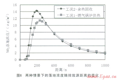(4)通過實際煙氣余熱回收與否兩種工況的濃度對比分析,得出:余熱回收工況NOx最大落地濃度略有增加,但是迅速衰減。無論是哪一種工況,其排放均遠低于《環(huán)境空氣質(zhì)量標準》(GB3095—2012)中的二類區(qū)NO2lh平均值(200mg/m3);且余熱回收工況最大落地距離減小了l7.6%,減小了污染范圍。