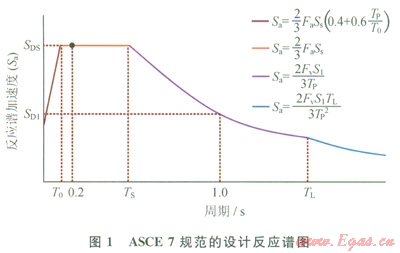 頻譜分析法中頻譜的設(shè)計(jì)與取值通常參照美國(guó)土木工程師學(xué)會(huì)ASCE 7—05《建筑物和其他結(jié)構(gòu)的最低設(shè)計(jì)載荷規(guī)范》(Minimum Design Loads for Buildings and Other Structures)[14],相對(duì)我國(guó)的GB 50011《建筑抗震設(shè)計(jì)規(guī)范》其取值較為保守[]15]。圖1為ASCE 7規(guī)范的設(shè)計(jì)反應(yīng)譜示意圖,它的周期區(qū)間分為4個(gè),不同的區(qū)間所對(duì)應(yīng)的反應(yīng)譜加速度計(jì)算公式不同(圖1中列出),其中,SDS和SD1用于選擇抗震設(shè)計(jì)類(lèi)別和分析方法。