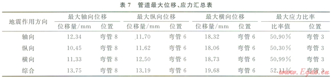 5)綜合地震作用所產(chǎn)生的管道位移、應(yīng)力較任一單方向地震作用高,說(shuō)明綜合地震載荷對(duì)管道的破壞最大。