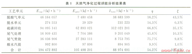 由表l可以看出,硫磺回收單元和尾氣處理單元效率最高,這是由于這2個單元主要為過程余熱回收單元,將過程反應產(chǎn)生的余熱通過余熱鍋爐進行回收;而脫酸氣單元和脫水單元的效率較低是由于其再生過程為一個能低效的過程。從整個過程的損失分布來看,脫酸氣單元的損失最高,這是由于普光氣田天然氣凈化廠處理的原料氣中H2S含量很高,需要更大溶劑循環(huán)量才能使凈化氣達到商品氣標準,這導致再生過程的能耗大大增加,而溶液再生過程為典型的低效過程,因此造成了較高的損失。