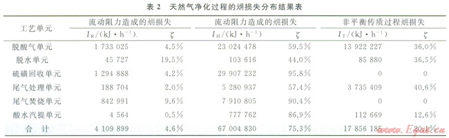 由天然氣凈化過程能量結果模型可知,天然氣凈化裝置損失可分為3類:由流動阻力造成的損失(IR)、換熱過程損失(IH)和非平衡傳質(zhì)過程損失(IT)。表2為天然氣凈化過程損失分布結果。