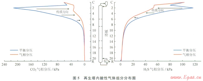 在考慮解析塔分析的同時,必須兼顧解析塔內(nèi)酸氣解析效果,圖5所示為再生塔內(nèi)酸性氣體組分分布情況。
